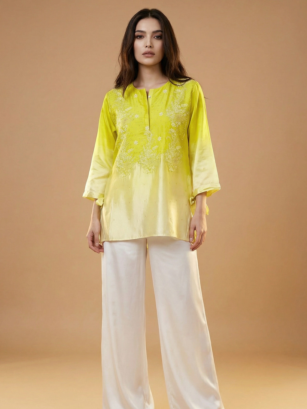 Ombre dyed Silk in lime green with Chikankari and embellishments on pure silk organza patched on silk fabric.